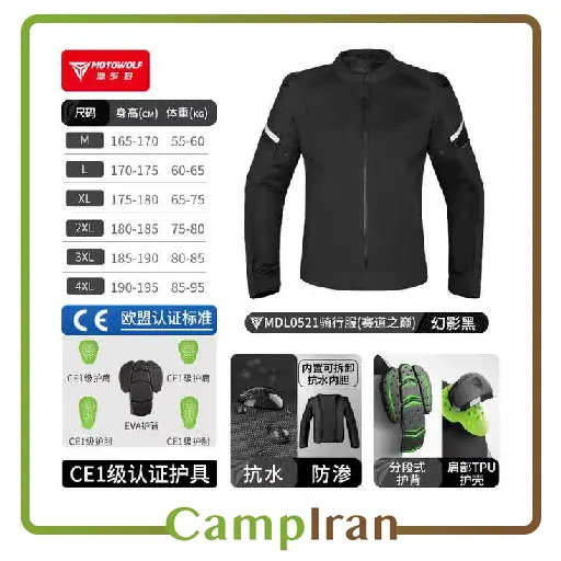 کاپشن موتور سیکلت 0521 با محافظ‌های CE، ضدآب و تنفسی، جنس مقاوم و طراحی فنی، محافظی خوب برای سواری شهری و جاده‌ای است.