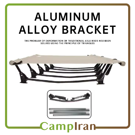 فریم این تخت از آلومینیوم ساخته شده که در عین سبکی، استحکام مناسبی دارد. استفاده از آلومینیوم باعث می‌شود تخت در برابر زنگ‌زدگی و رطوبت مقاوم باشد و برای استفاده در فضای باز، محیط‌های مرطوب یا سفرهای مکرر کاملاً مناسب عمل کند. این ویژگی دوام بالای تخت را تضمین می‌کند و امکان استفاده طولانی‌مدت بدون افت کیفیت را فراهم می‌سازد.